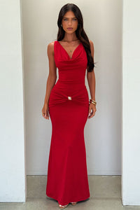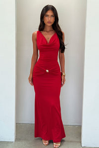 Slip into the Alison—the ultimate show-stopper for any occasion! This maxi features a dramatic cowl neckline and open back with adjustable shoulder straps for the perfect fit. The bodycon silhouette hugs your curves while the stretchy, fully lined mesh keeps you comfortable all night long. A striking gold hardware waist panel adds that extra touch of glamour. Whether you're heading out for cocktails with the girls or making a statement at a formal event, pair it with your favourite heels and gold jewellery for an unforgettable look!