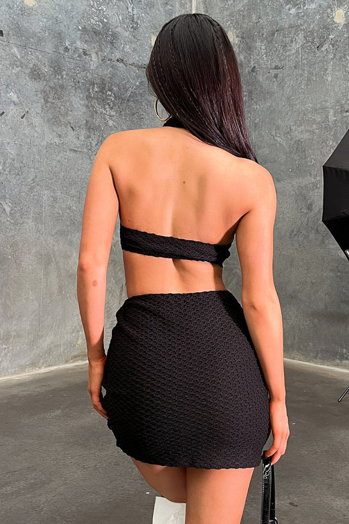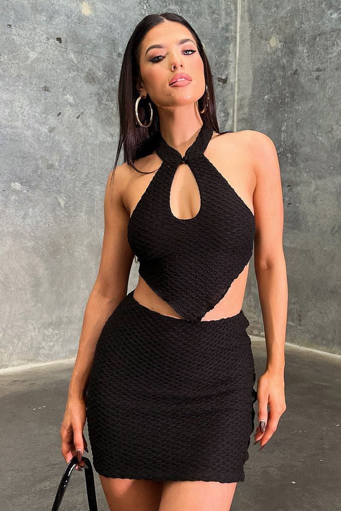 Sweet and sexy! The Ally Skirt offers a stretchy textured material, cheeky side slit, an elasticated waistband and double lining. Style her with the matching crop and some boots for a killer look!