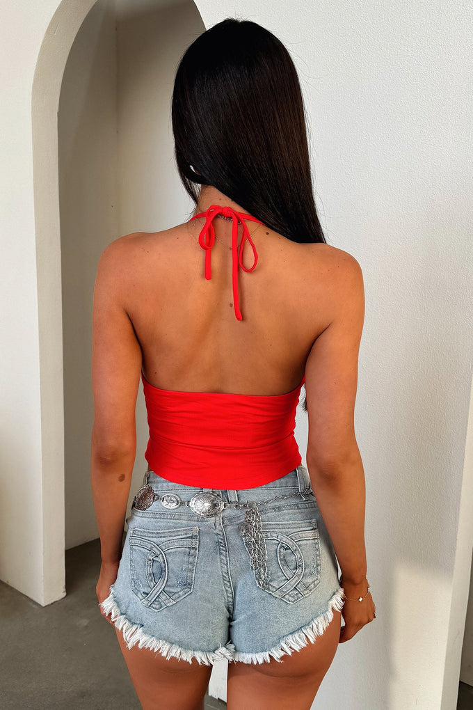This sleek crop top will turn everyones heads! The Calison Crop stands out with its halter neck straps, pointed triangle hem and cut out detail in the centre. Crafted from double lined fabric, you'll look great all night long at your next dinner date - just add some jeans and some heels and you're golden!