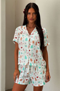 Get ready for Santa's arrival in our Claus Top! This short sleeve pyjama top features a festive "Santa Baby" Christmas print and a convenient button up closure. Made with soft material, complete the set with our Claus shorts or pants. Perfect for pairing with ugg boots on Christmas morning!