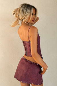 Get festival-ready with our Cobalt Top in Burgundy! This corset style top features thin adjustable shoulder straps for a personalized fit, a front cut out for a touch of edge, and silver eyelet detailing for a touch of glam. Complete with a hook and clasp front closure and lace up back tie, pair this top with the Cobalt mini skirt and boots for the ultimate festival outfit!