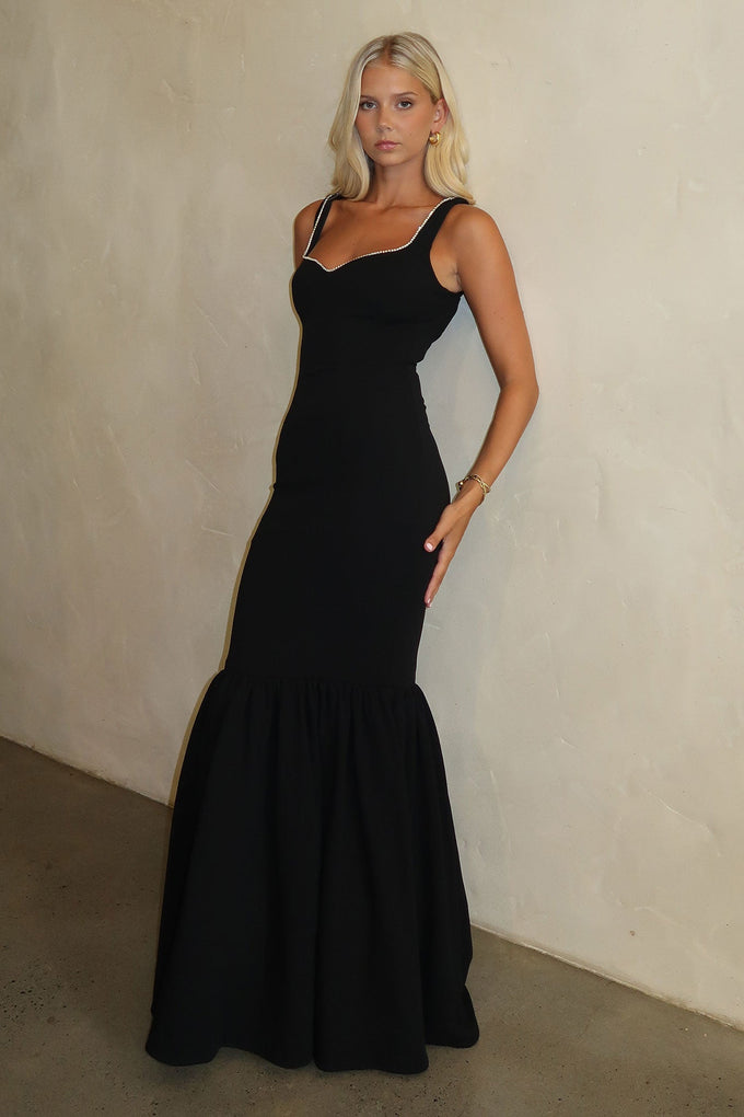 Get ready to slay the prom with the Emberly Maxi Dress! This stunning black dress features a sweetheart neckline, rhinestone detailing, and adjustable straps. The thick fabric and tulle under layer create a poofy skirt for a fun, playful look. Lined with stretchy fabric and an invisible back zip with hook and eye closure, this dress provides comfort and convenience. Complete the look with silver jewellery and heels!