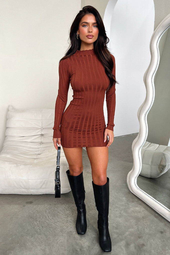 Turn up the heat this winter in the crowd fave Emily Dress in Brown. This fitted beauty is made from a stretchy ribbed fabrication with a turtle neck, ribbed detail along the hems and long sleeves. Take her to her full potential with thigh high boots and a leather jacket.