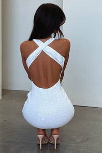 She's a guaranteed show stopper! The Evanka Dress features an all over sequin covered material with double lining, a backless cut with criss cross shoulder straps and a shaping bodycon fit. Style this gorgeous darl with stiletto heels and silver accessories for a full on glam night.