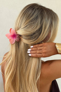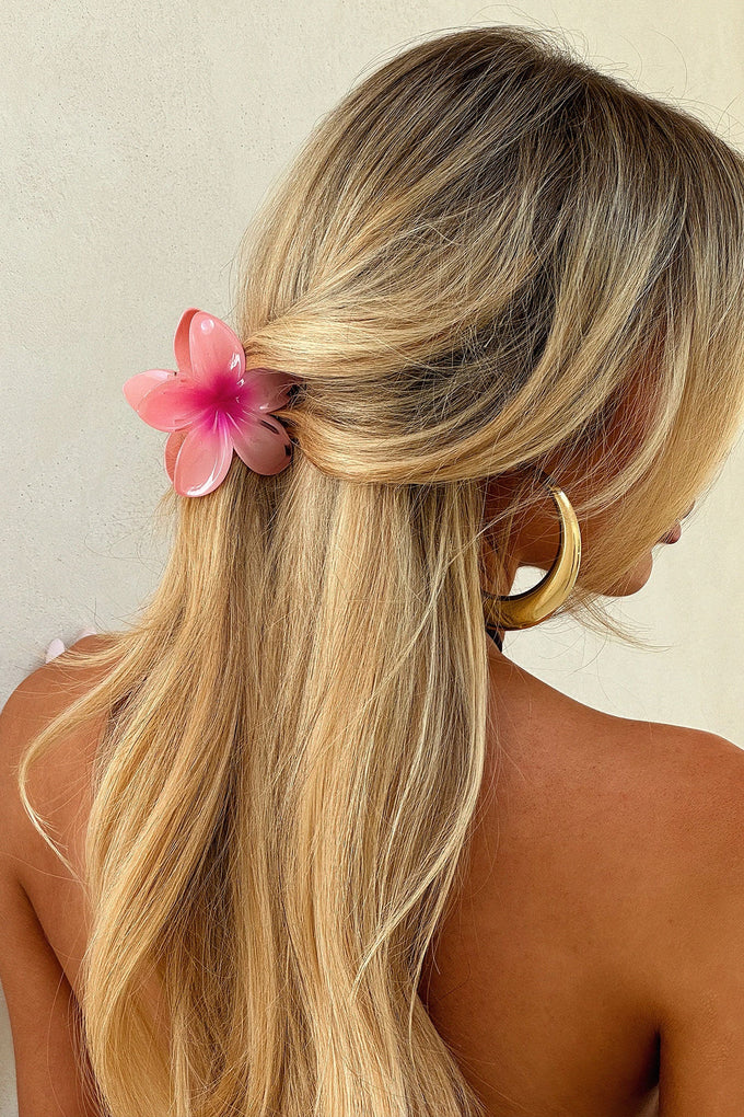 Add a pop of playful charm to your summer look with the Frangi Claw Clip! Crafted from durable plastic and shaped like a delicate flower, it’s the perfect accessory to secure your hair while adding a fun, tropical vibe. Pair it with a cute crop top and denim skirt for your next holiday adventure or sunny day out!
