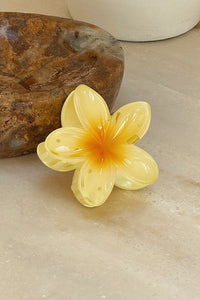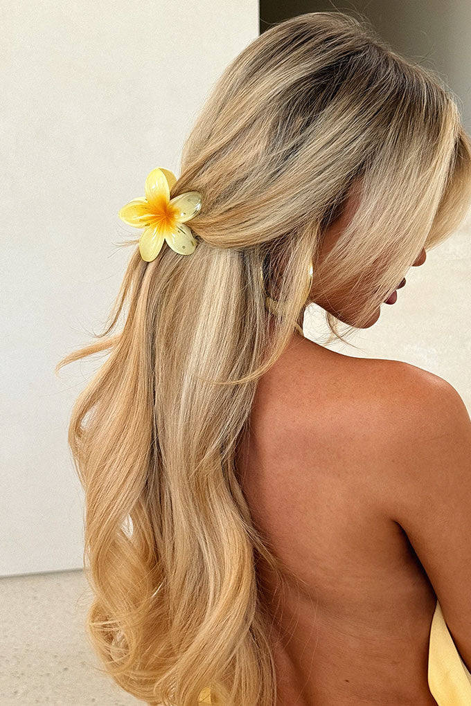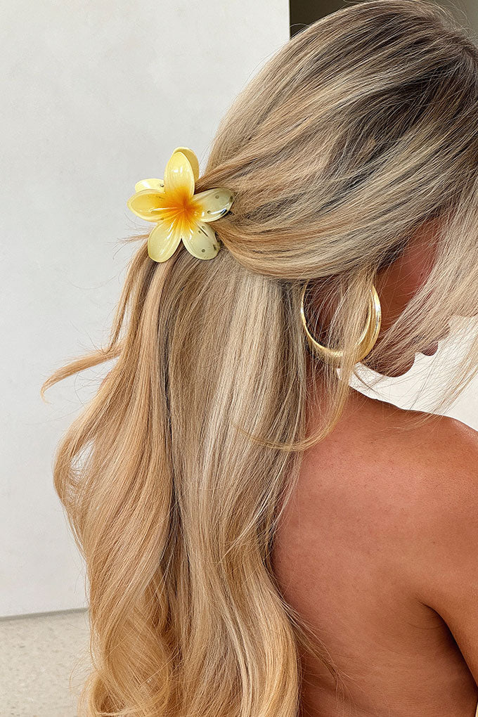 Add a pop of playful charm to your summer look with the Frangi Claw Clip! Crafted from durable plastic and shaped like a delicate flower, it’s the perfect accessory to secure your hair while adding a fun, tropical vibe. Pair it with a cute crop top and denim skirt for your next holiday adventure or sunny day out!