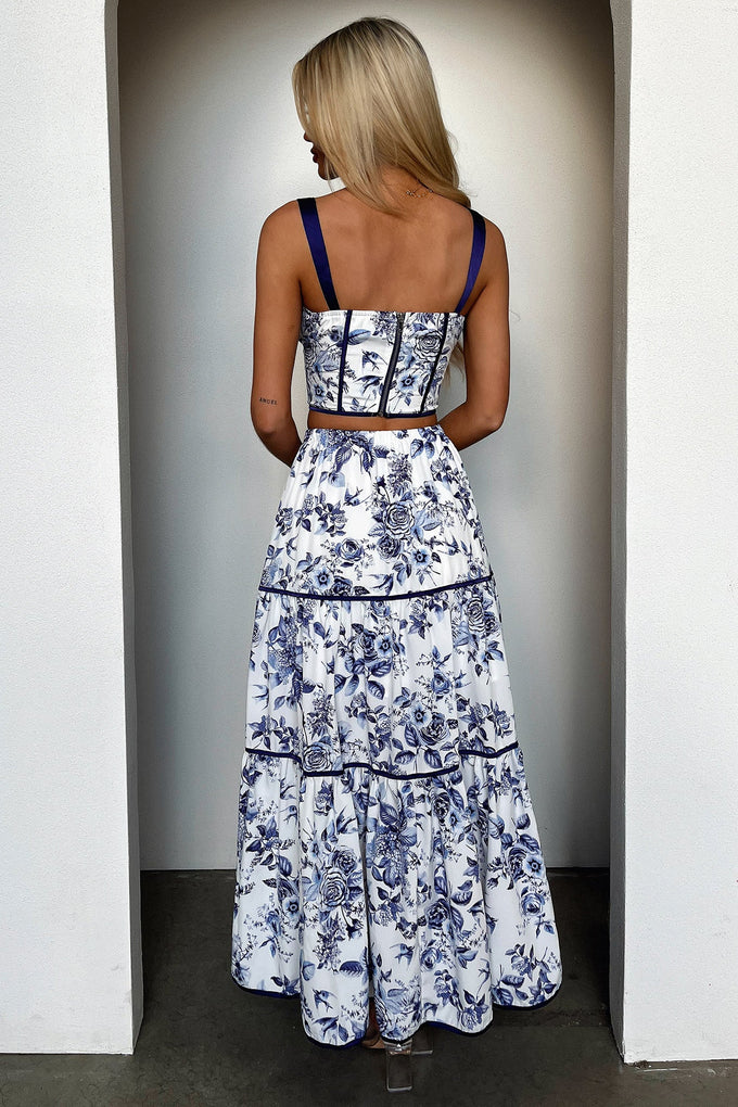 Get ready to turn heads with the Joy Top - Blue Floral. This corset-styled crop top features a unique blue floral detailing that is sure to stand out. The front tie and thick straps not only add style, but also provide a comfortable fit. Complete the look with the matching Joy Maxi and white sandals!