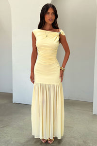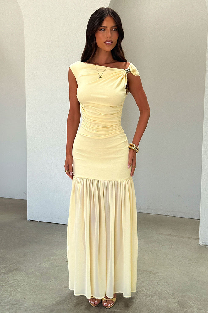 The Kalister Maxi Dress is your ticket to effortless elegance! This stunner features a high neckline and closed back for understated sophistication, while gold detailing on the shoulder strap adds a touch of glamour. The bodycon bodice hugs in all the right places with mesh lining for a hint of allure, and side ruching creates a flattering silhouette. Transition seamlessly into the flowing maxi skirt for movement and drama. Style with heels and your favourite bag for a night out that'll have everyone asking where you got your dress!