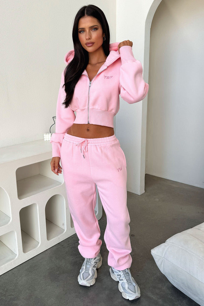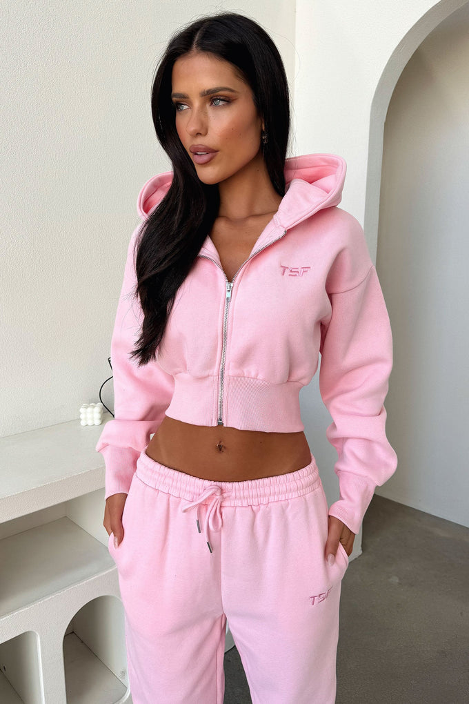Stay comfy and stylish in the Kaztek Cropped Jacket. Its soft material and long sleeves make it perfect for lounging, while the embroidered TSF logo and silver zip add playful details. With a hood and cropped fit, it pairs perfectly with the Kaztek low rise sweatpants and ugg boots.