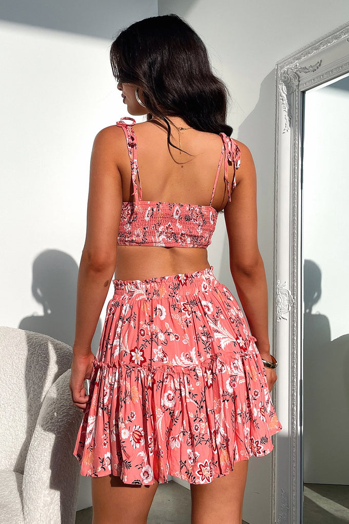 Have you ever seen a cuter crop? We are in love with the gorg' Kimmio Crop. This crop is made from a super cute floral fabrication, with thin tie up straps and shirred, elastic back for the perfect fit. She looks great paired with the matching Kimmio Skirt or with a cute denim skirt and slides.