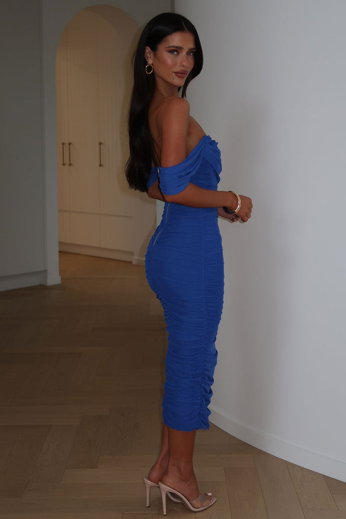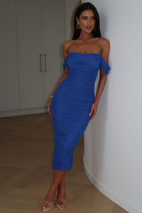 All around a total babe! The Lucinda Midi Dress offers double lined material with a mesh top layer, ruching down the sides, a silver zipper at the back, a straight cut neckline and off shoulder sleeves. Style this beaut with black heels, a sleek pony and a red lippy for a fierce yet elegant look.