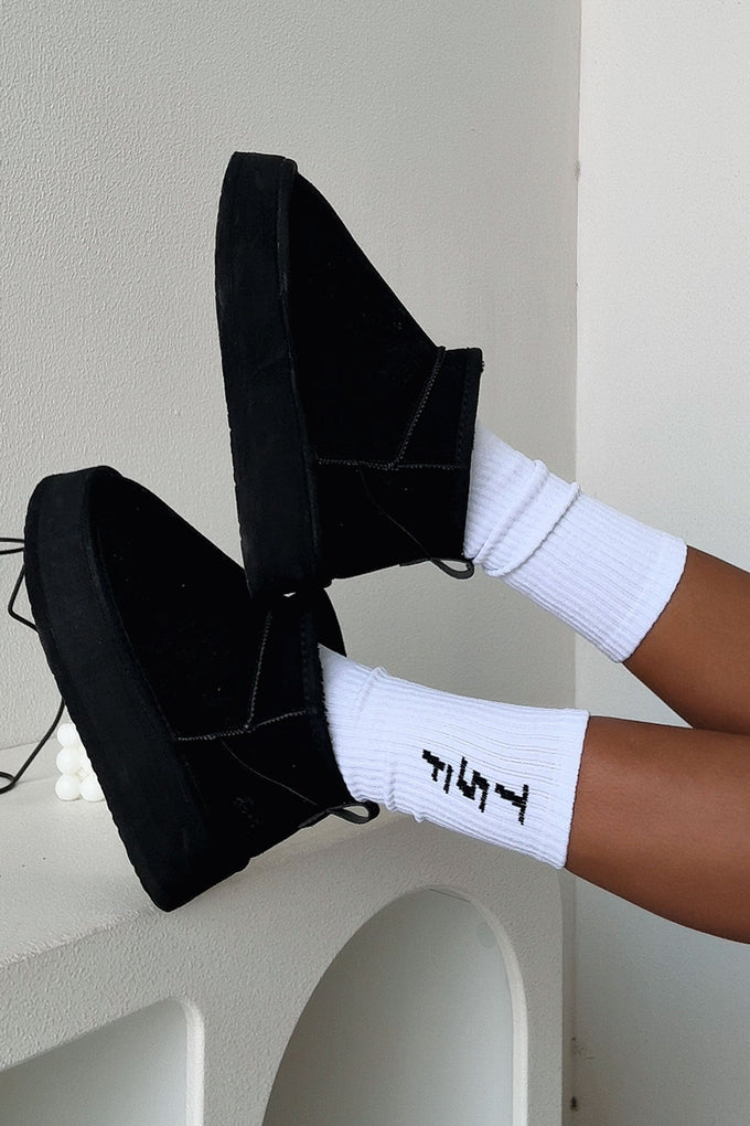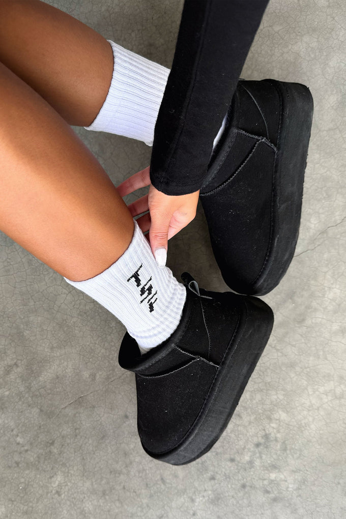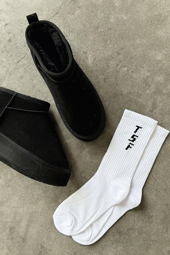 Add a playful twist to your outfit with Missy Socks in White/Black. These mid-length socks feature a soft ribbed material and a large TSF logo down the side. With their comfortable fit, they're the perfect everyday sock for keeping your feet happy and stylish!