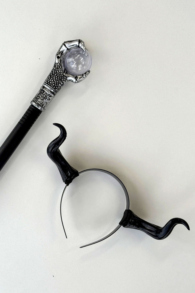 Complete your villainous look with the playful Mistress of Evil 2 Piece Accessory Kit! It includes a multi-assemble stick with a claw and ball, plus a bold black horn thick headband. Pair these wicked accessories with the Mistress of Evil costume and get ready to own your dark side with style and flair!