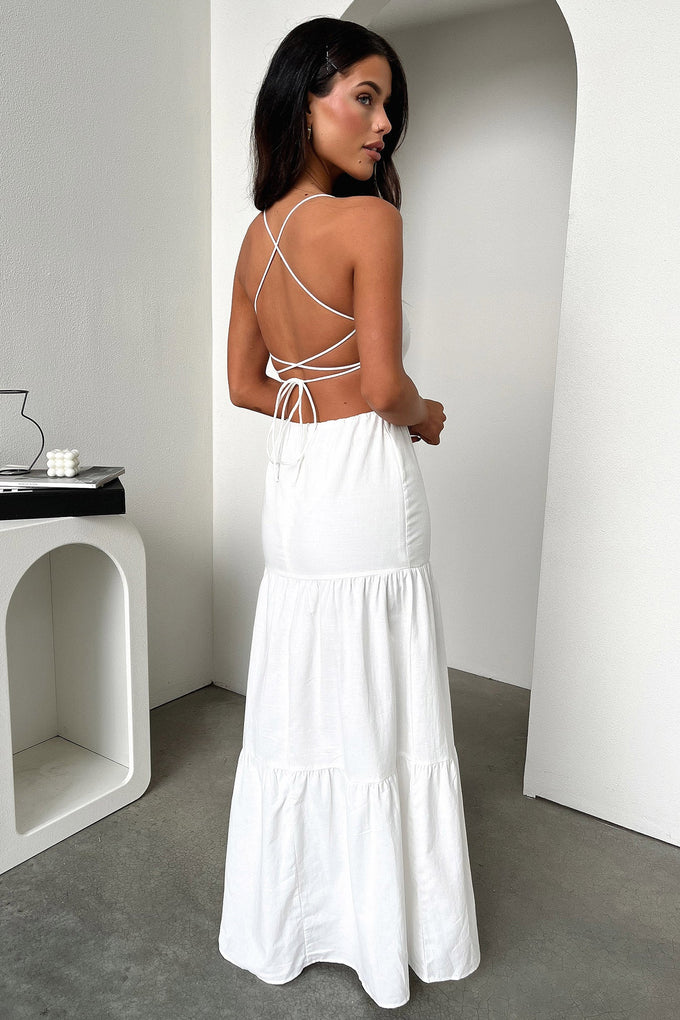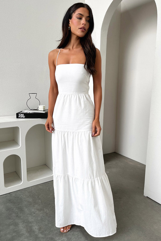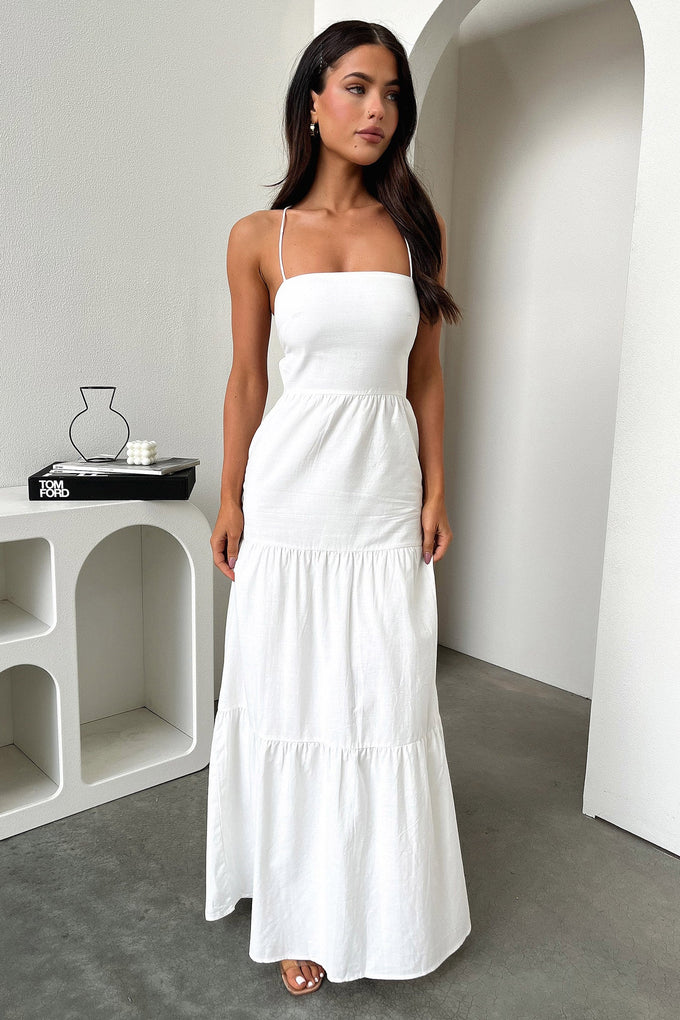 Make your grand entrance in the Nethia Maxi Dress! This showstopper features a strappy backless design, a flowy tiered skirt, and a double lining. Plus, an invisible back zipper means you'll be able to slip in and out of this beauty with ease. Finish off the look with strappy heels and some gold jewellery!