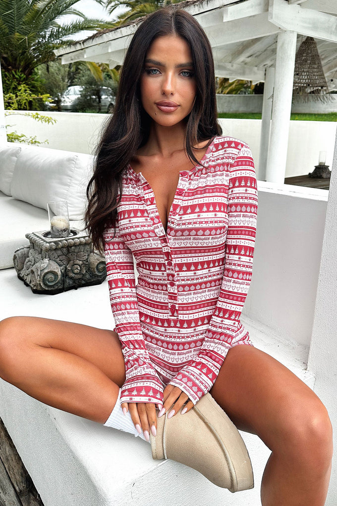 Unwrap the perfect holiday delight with our Noelle Romper in Red. Made of ribbed material, this long sleeve Christmas romper features a center front button up closure and a festive "thatssofetch" design. The ideal pyjamas for opening gifts on Christmas morning!