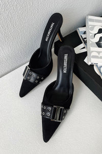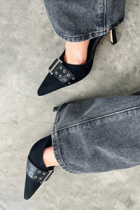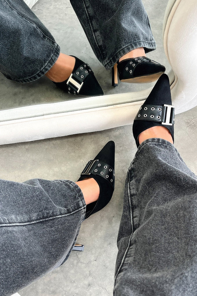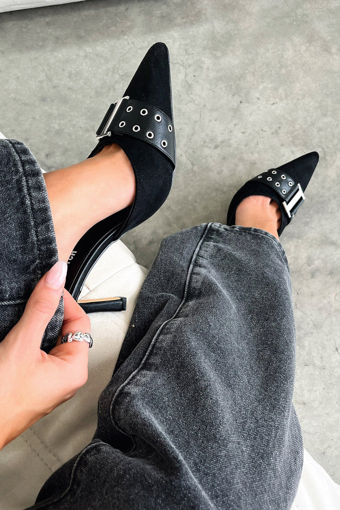 Slip into style with Odina Heels in black! These closed-toe heels feature a silver buckle detail, adding a touch of glam to any outfit. Pair them with jeans and a corset for a chic dinner date look!