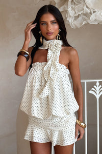 The Palo Strapless Bubble Mini Dress in ivory polka dots is your go-to for playful summer vibes. Featuring a stretchy neckline and side gathers, it offers a perfect fit that moves with you. The bubble silhouette and ruffle skirt add flirty volume, while built-in shorts and a side zip ensure comfort and confidence. Complete with a detachable flower detail, this dress shines paired with white heels on your next sunny getaway!