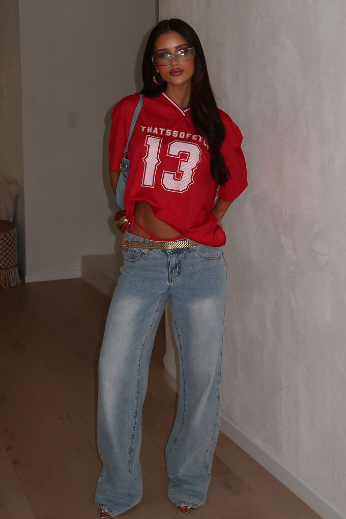 Score style points with this oversized jersey tee featuring a V-neck and bold number detail! The Thats So Fetch logo adds a sporty vibe, making it perfect to pair with sunglasses and denim shorts for a playful, varsity-inspired look!