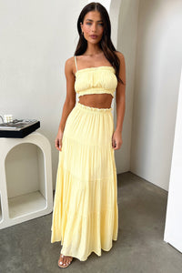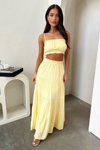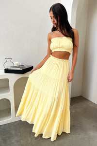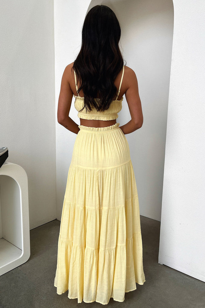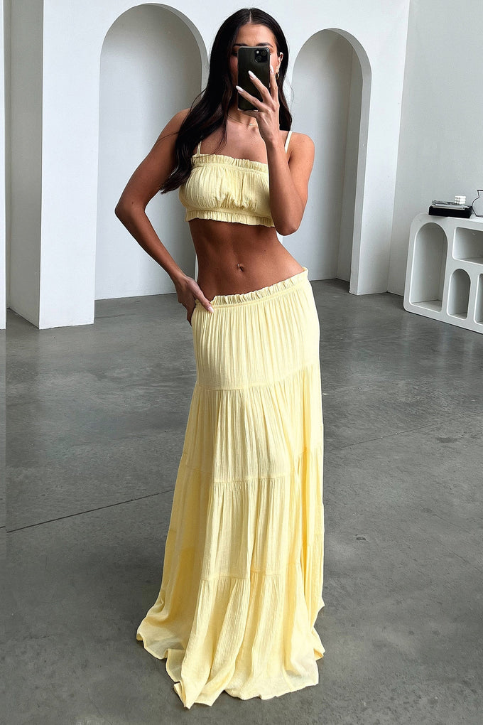 Summer vibes in the Selina Set! This gorg crop offers a frilly neckline with an elasticated band for lots of stretch, double lined material and thin adjustable straps. Style her with the matching skirt and a pair of White Sandals.