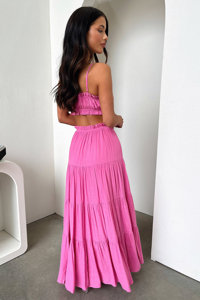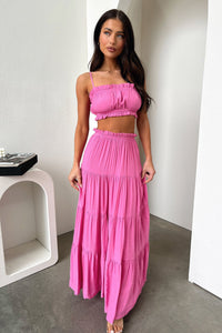 Summer vibing in the Selina Set! This gorg maxi skirt features an elasticated waistband with frilled edges, a flowy fitting skirt and double lined material. Style her with the matching crop and a pair of White Sandals.
