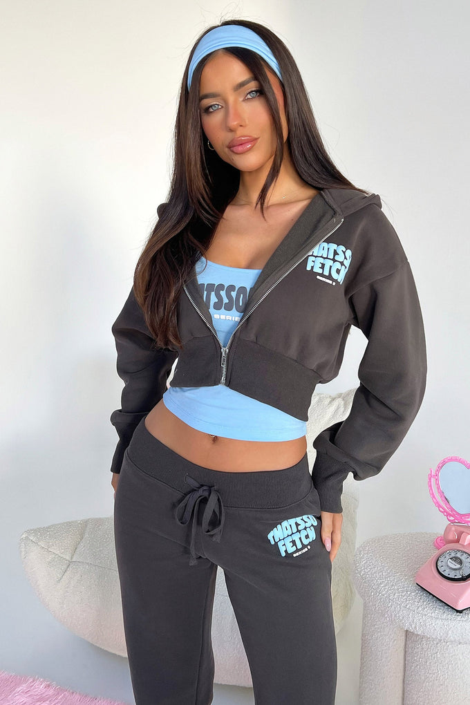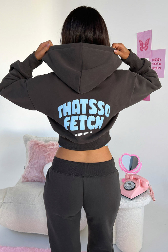 Stay stylish and cozy in our Series 5 Cropped Jacket. With a trendy hood and cuffed sleeves, it's perfect for any weather. The silver front zip adds a touch of edginess while the soft material keeps you comfortable. Don't miss the THATSSOFETCH logo on the front and back. Complete the look with our matching low rise shorts and tee!