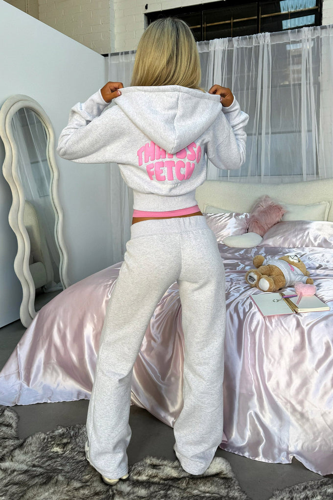 Stay stylish and cozy in our Series 5 Cropped Jacket. With a trendy hood and cuffed sleeves, it's perfect for any weather. The silver front zip adds a touch of edginess while the soft material keeps you comfortable. Don't miss the THATSSOFETCH logo on the front and back. Complete the look with our matching low rise shorts and tee!