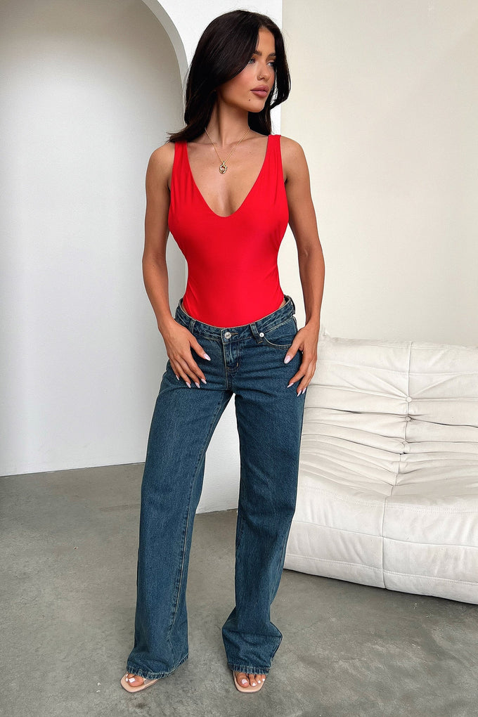 Feel confident and flirty in this red Sofia bodysuit! Its double lining and soft material provide a snug fit while you show off the deep scoop neckline. Dress her up with jeans and heels for a date night you'll never forget!