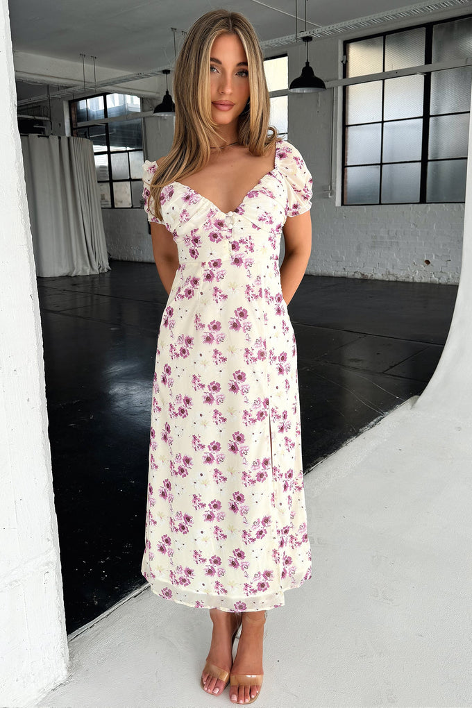 The prettiest dress for a cute Sunday brunch date! This beauty offers a sweetheart neckline, short puffy sleeves with frilled edges, buttons down the front, double lining, shirred material across the back, an invisible side zipper, a flowy fit and a cheeky side slit. Style her with Your go to flats, a little tote and some sunnies.