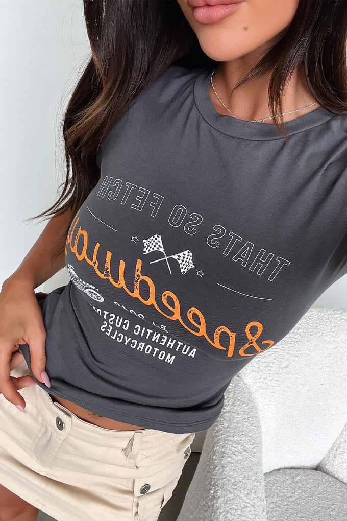 Get ready to shift into fashion gear with our Speedway Tee! Featuring a crew neckline, cap sleeves, and soft stretchy material, this tee is perfect for any summer day out. With an exclusive ThatsSoFetch graphic, pair her with some denim shorts for a fun and stylish look!