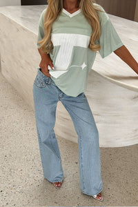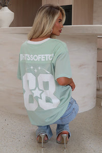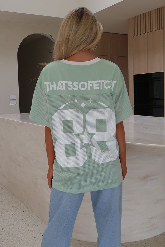 Embrace effortless cool with the Think Later Jersey Tee in green! This short sleeve oversized, jersey-style tee features a bold white "T" on the front, the ThatsSoFetch logo on the back, and a standout number and star detail. Its relaxed fit makes it perfect for layering or rocking solo. Pair with a denim skirt and boots to nail that playful, concert-ready vibe!