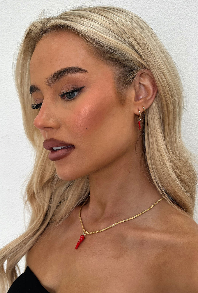 Add some spice to your style with the Tosca Necklace! This 18K gold plated chain necklace features a playful touch of red chili detailing. Complete the set with the matching Tosca earrings, perfect for pairing with low rise jeans and a cute top. Don't miss out on this unique and trendy accessory!