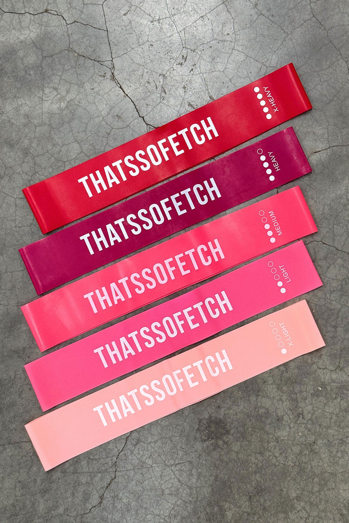Elevate your workout with the TSF Resistance Bands Set—three versatile bands in varying resistance levels to challenge every fitness level! Each band features our signature That's So Fetch logo, so you'll look as good as you feel. The included compact clear case makes it easy to toss in your gym bag or take anywhere your fitness journey leads. Whether you're at home, the studio, or traveling, these bands are your portable powerhouse for strength training, and mobility work!